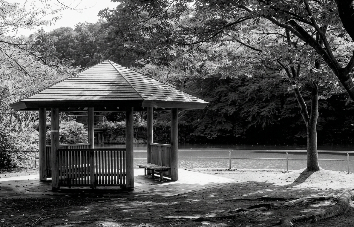 学生時代、彼女と二人で新宿御苑を散歩していた時、ふと目に止まった東屋で休憩した思い出がある。どんな話をしたのかは覚えていないが、都会のど真ん中にいるとは思えないほど静かで、ただ腰を下ろしてなんとなく会話をしていただけなのに、不思議と時間がゆっくり流れていた。居心地の良いひと時だったことを今でも覚えている。